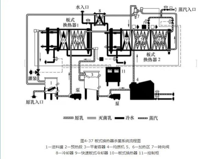 低溫冰水、乙二醇機(jī)組(+1℃),制作低溫冰水、乙二醇水送到加工車間,利用高效板式換熱器冷卻高溫消殺后的乳品,快速降溫