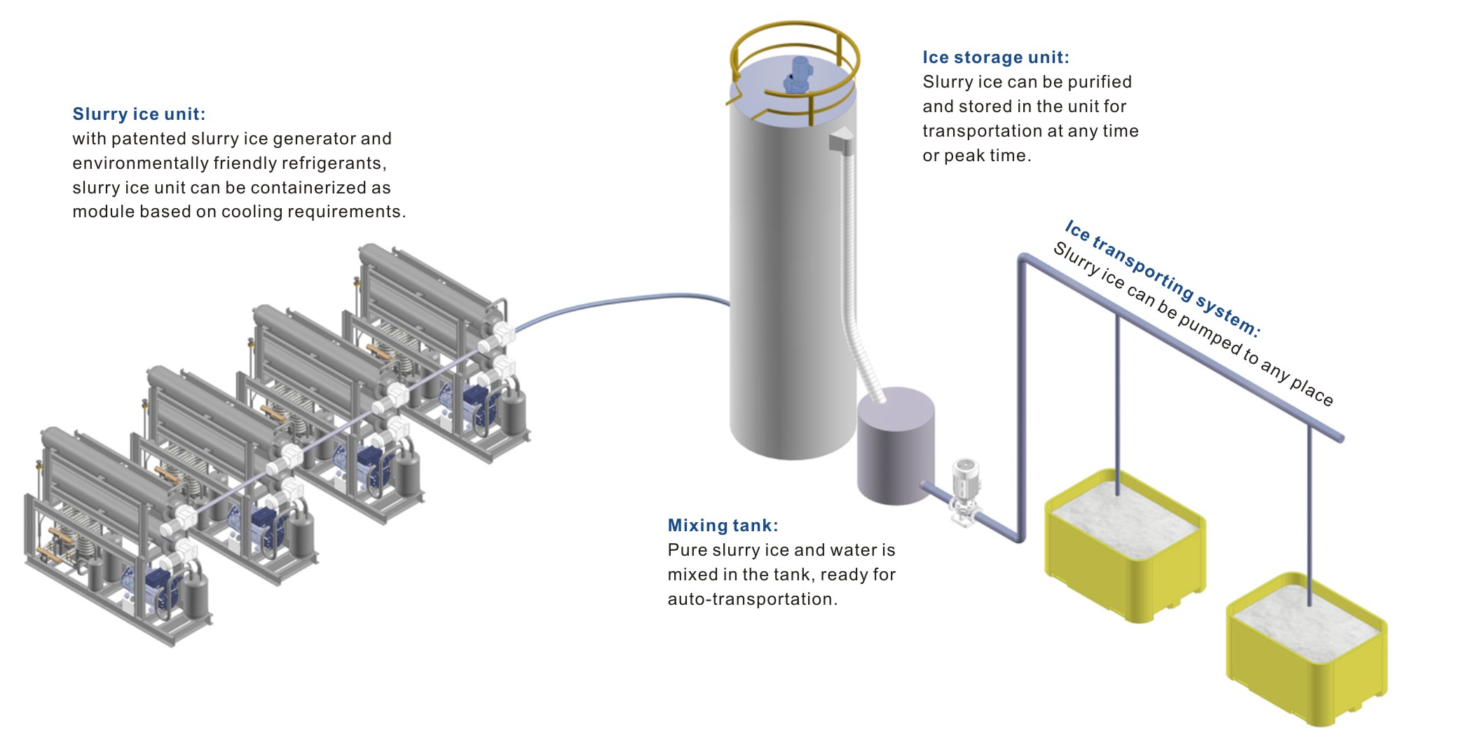Slurry ice is well known for its advantages of rapid chilling, pumpable ice crystals and low energy consumption, it is commonly used in a wide range of applications such as air conditioning, packaging, industrial cooling processes, supermarkets, and cooling /storage of fish, poultry and other perishable products.
